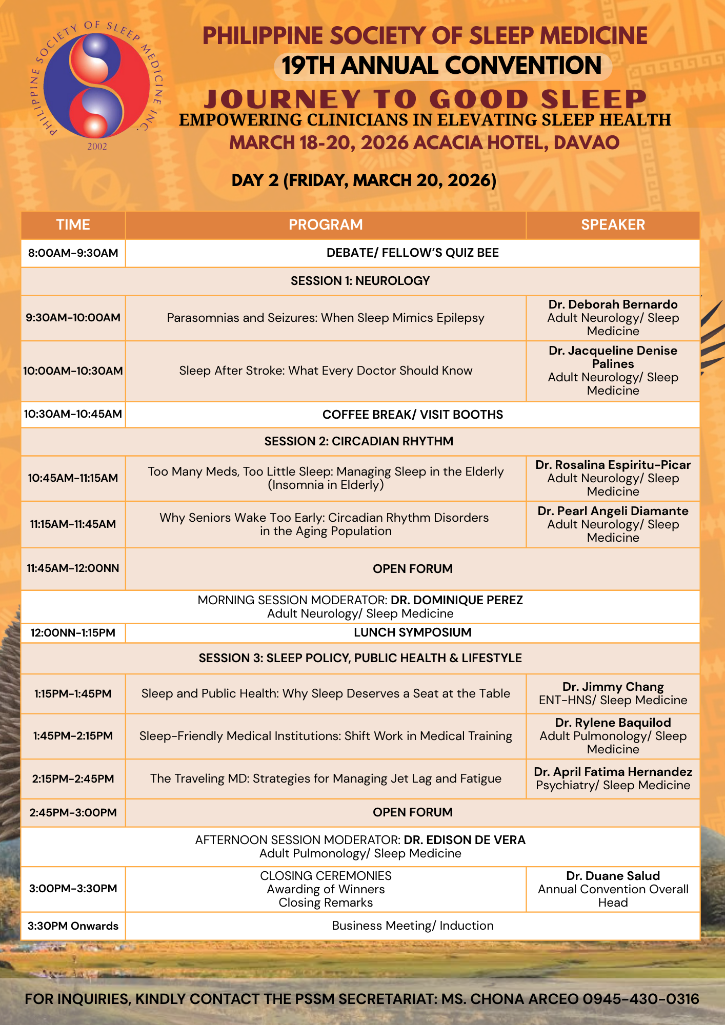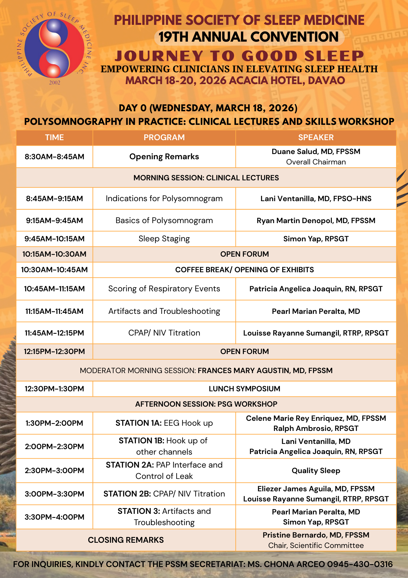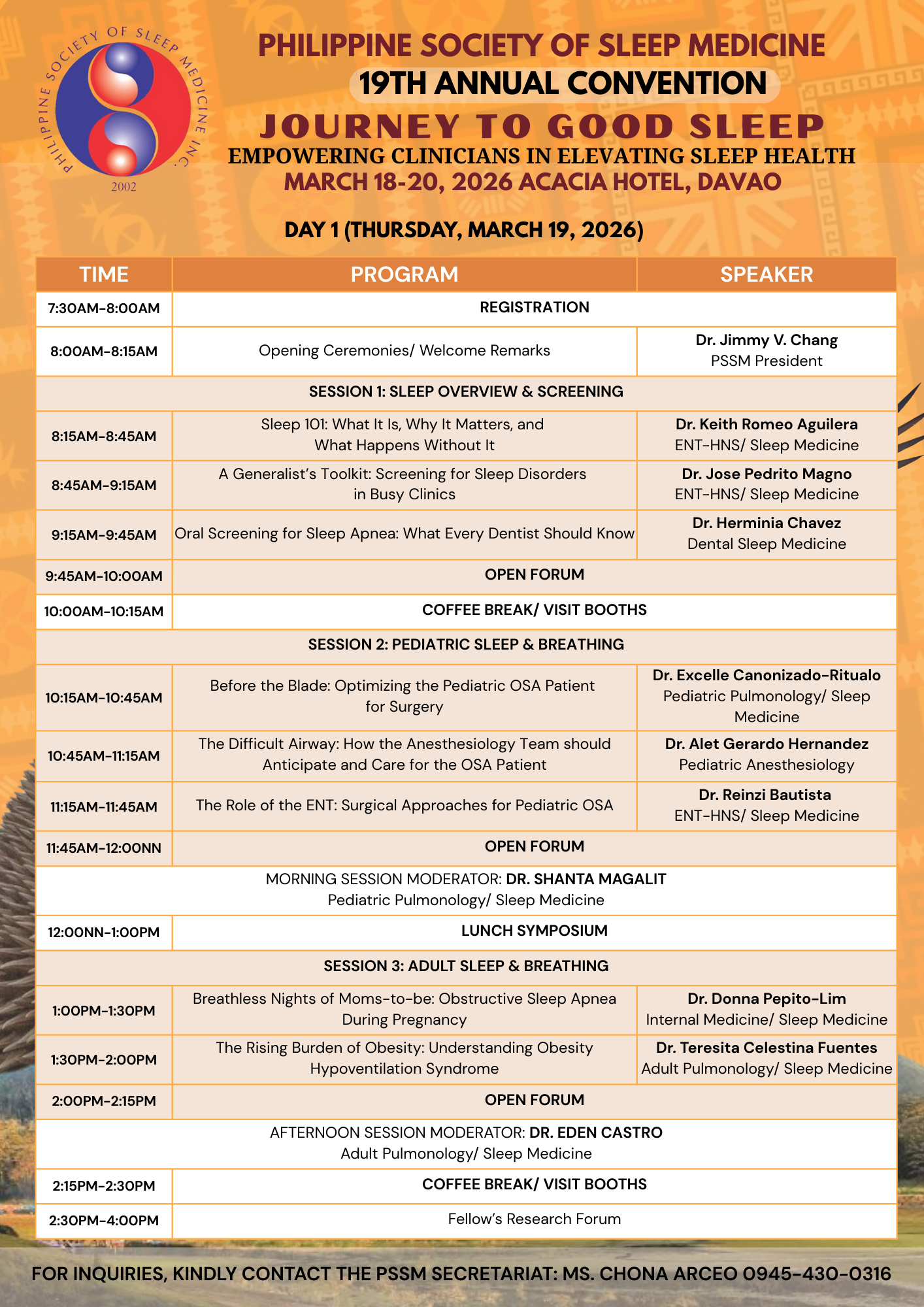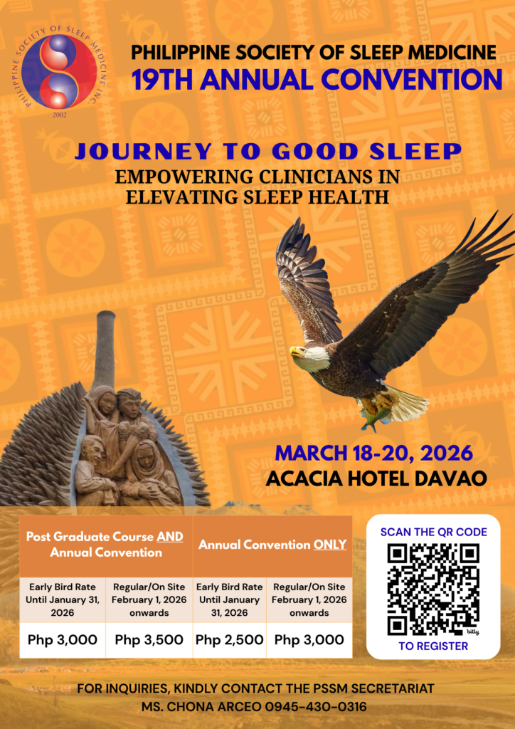 Guided by the Society’s mission of improving sleep health in the Philippines by educating professionals on sleep disorders, the PSSM focuses on the significant role clinicians play in addressing the nation’s sleep crisis in the PSSM 19th Annual Convention with the theme “Journey to Good Sleep, Empowering Clinicians in Elevating Sleep Health,” happening on 18-20 March 2026 at the Acacia Hotel, Davao City.